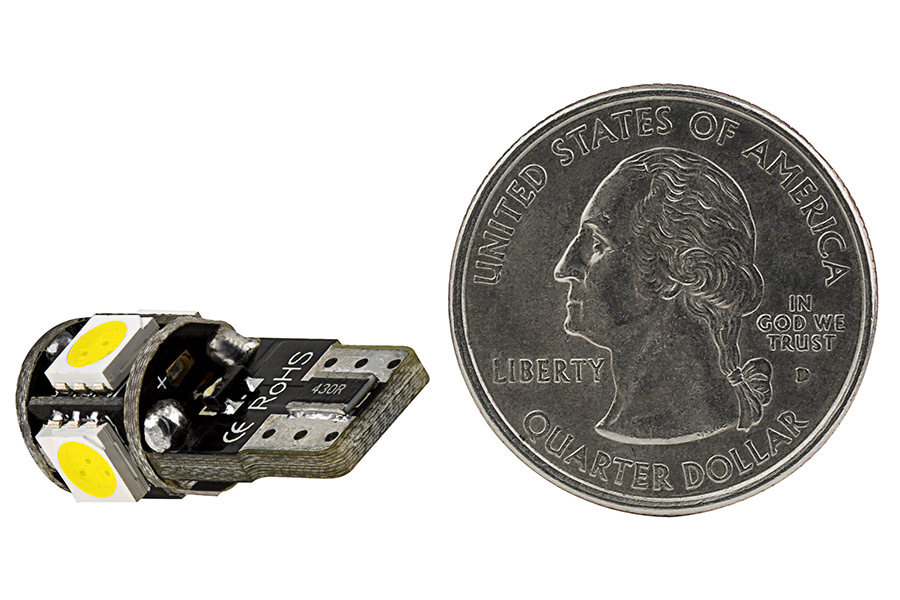 CAN Bus LED replacement bulbs can fit numerous vehicle applications such as trunk lights, hood lights, dome lights, map lights and footwell lights. This 194 bulb replaces a variety of traditional bulbs including 194, 168 and 912 bulbs. It has 5 LEDs (5050 SMD) that are radially mounted to create a 360° viewing angle for better, allover light emission with reduced hot spots. Error-free LED bulbs are designed to communicate with your vehicle's CAN Bus computer system and prevent "bulb out" error messages. Short, tower-style design with miniature wedge base for easy plug-and-play installation. The energy-efficient bulb has 12V DC operation and is designed to last 30,000 hours on your car, truck, SUV, or van—25 times longer than incandescent bulbs. Available in cool, natural, and warm white, amber and red. Not sold in pairs. Price per bulb.